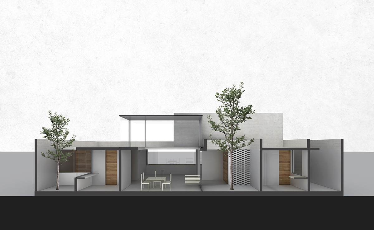 El proyecto busca, a partir de una secuencia de patios y dobles alturas vincular la vida de la planta baja con la planta alta tanto en las zonas comunes como en las privadas. La planta baja tiene un carácter muy sólido derivado de la materialidad de la tierra, mientras que la planta alta se desplantan una serie de volúmenes a forma de pabellones que configuran dos espacios de terraza y una sala de cine.
